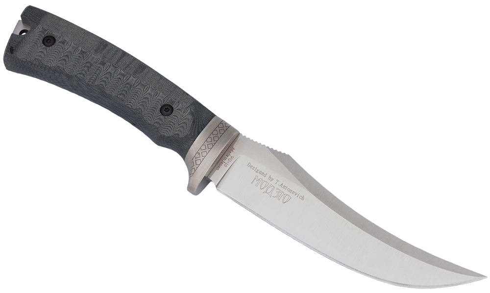Рукоять изготовлена из микарты с 3D обработкой, удобно лежит в руке и не скользит. Наличие гарды предохранит руки от случайных порезов, соскальзывания при нанесении колющего удара или разделке туши. |