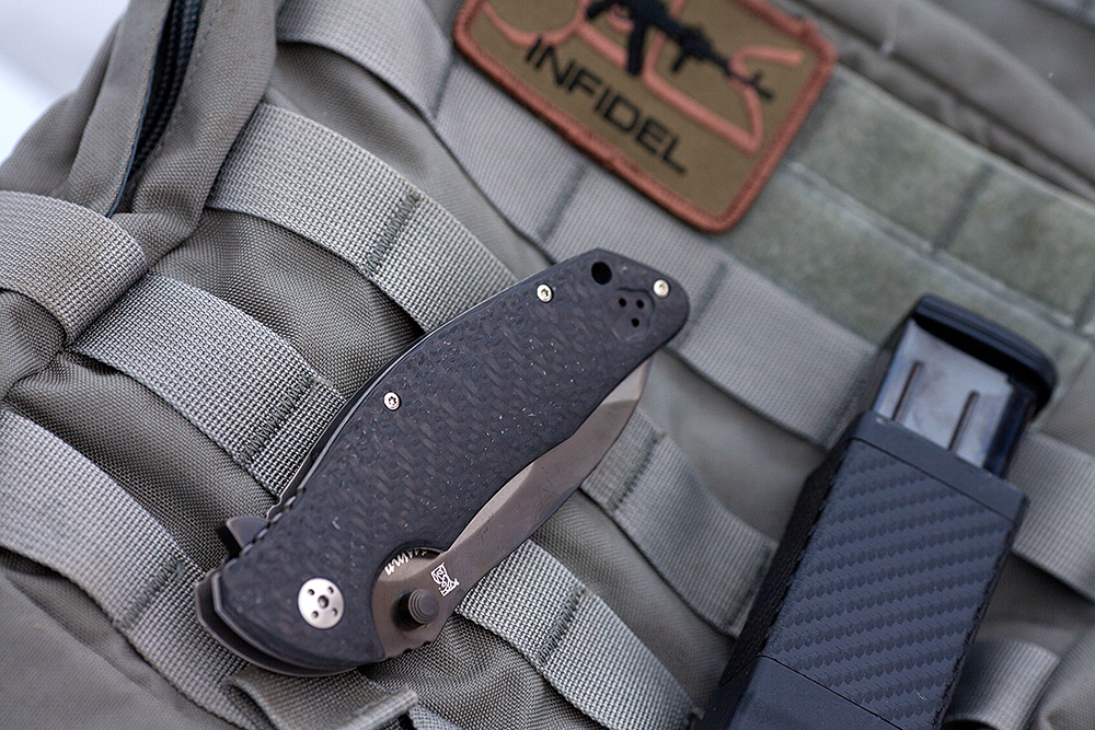 Для открывания ножа одной рукой на клинке размещены шпеньки под правую и левую руку в районе обуха, а в районе пятки клинка размещен так называемый флипер.