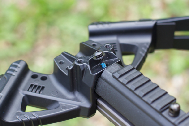 Замок арбалета со стволом не имеет жёсткой связи, так как установлен в пластиковый приклад и от нагрузки может изменять своё положение, особенно, если эксплуатация арбалета будет на перепадах температур. Планка Пикатинни тоже не имеет жёсткой связи с замком и установлена в виде коромысла, держащегося на распоте двух скрытых шестигранных болтов.