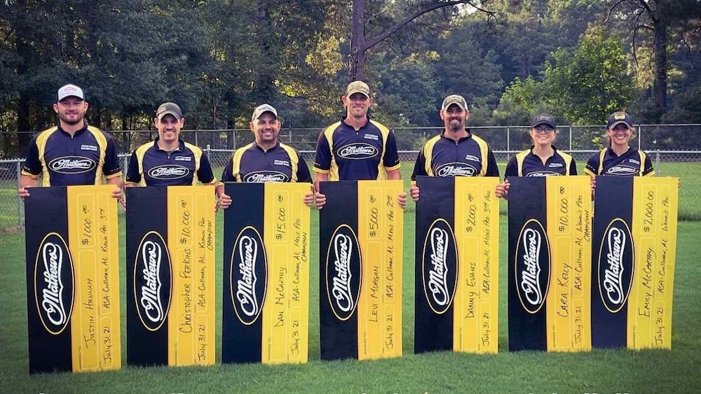 На недавнем мероприятии ASA в Каллмане, штат Алабама, команда Мэтьюз победила в мужском открытом дивизионе Pro. Дэн Маккарти (в центре) занял первое место, Леви Морган (слева) — второе, а Дэнни Эванс (справа) — третье.
