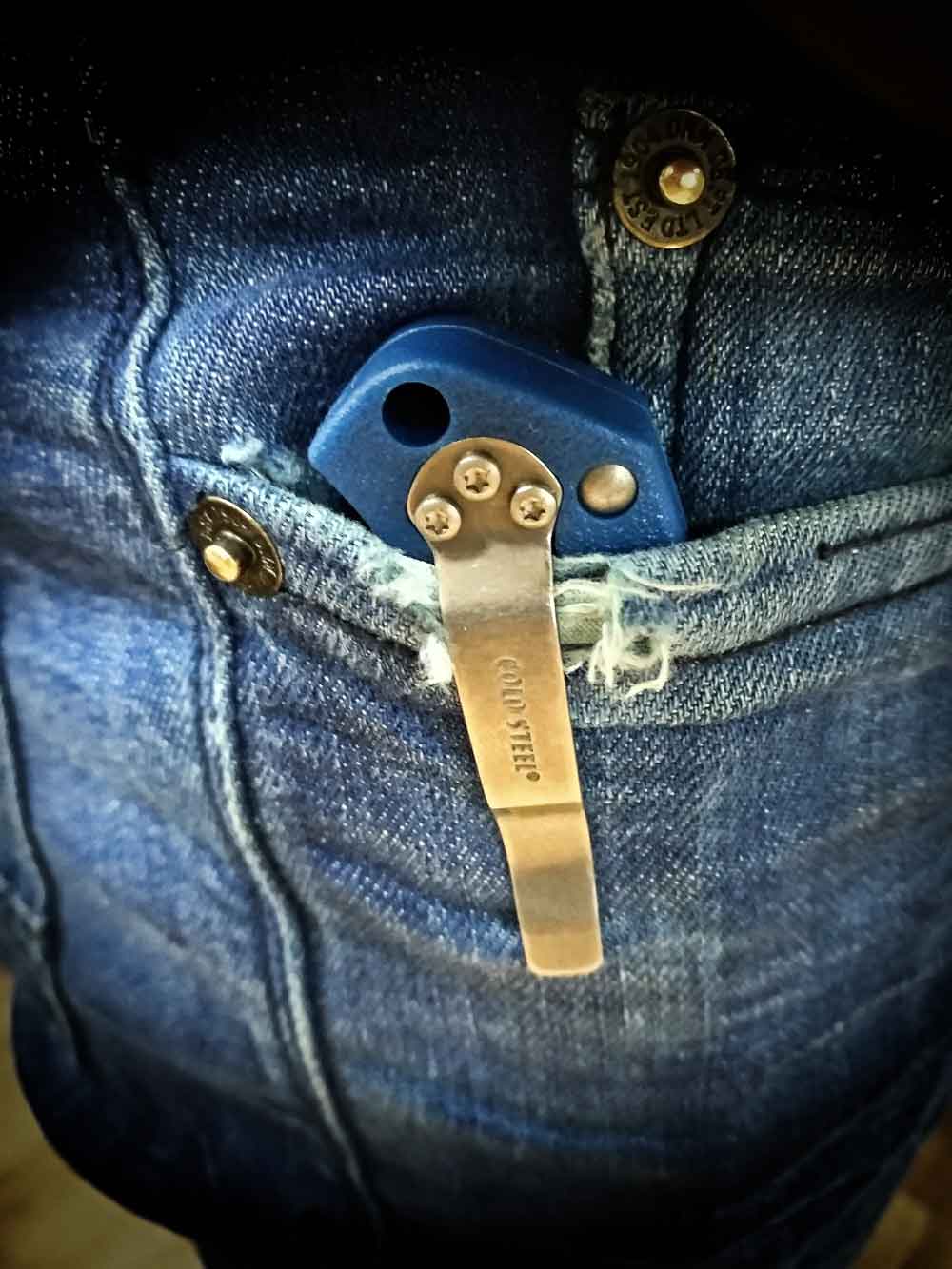 Pro-Lite немного широковат в кармане, но в этом нет ничего катастрофического. В самом широком месте она все еще уже, чем PM2, и он ощущается очень хорошо и тонко по сравнению с чем-то вроде модели Voyager. Я также уверенно одобряю клипсу. Угловатые зажимы - один из моих раздражителей, и я надеюсь, что Колд Стил в будущем будет двигаться в направлении прямых, необработанных клипов, как этот. Затянут клип идеально, длина в самый раз, и он кажется прочным. У меня нет претензий. Возможно, в кармане нож не дает таких потрясающих ощущений, как в руке, но все же Pro-Lite носится чертовски хорошо.