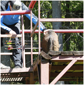 Особенно было сложно стрелять со светлой поляны по темной мишени, установленной в теневом участке леса. Непростой целью были мишени ВОЛК и ГРИФ, стоящие в темной части леса, когда позиция для стрельбы находилась, фактически, против солнца. Много неприятностей доставил стрелкам КОЗЕРОГ, расположившийся у края поляны под деревом. Перед ним - солнечная поляна, дистанция стрельбы 55 метров - все, как в естественных условиях. РЫСЬ тоже оказалась непростой целью - ровный ряд деревьев закрывал часть мишени, видно было только середину туловища, а стрела должна была пролететь дистанцию 40 метров сквозь узкий коридор. КАБАНА закрепили на вышке, и стрелять пришлось снизу-вверх, что доставило дополнительные трудности. ![]() | ||