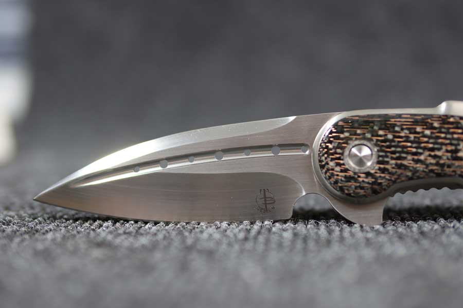 Клинок с флиппером изготовлен из порошковой стали Carpenter CTS — 204P, имеет особую форму — своего рода уорнклифф, перетекающий в дроп-пойнт. Финиш клинка — ручное сатинирование, дол полирован в зеркало. В титановом фрейме — декоративные вставки из карбона Star Strike (англ. – «звёздный удар»). Как Вы могли заметить, в структуре углепластика присутствуют волокна меди. Дело в том, что Star Strike является стилистической интерпретацией карбона Lightning Strike (англ. – «удар молнии»).