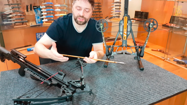 1. Горизонтальная плоскость. Тетива не участвует в разгоне стрелы. Ускорение происходит только за счёт энергии планок и тросов, наматывающихся на эксцентриковые канавки блоков. Круглые блоки обеспечивают легкий взвод, равномерный и плавный запуск стрелы, а так же препятствуют горизонтальному смещению хвостовика стрелы.